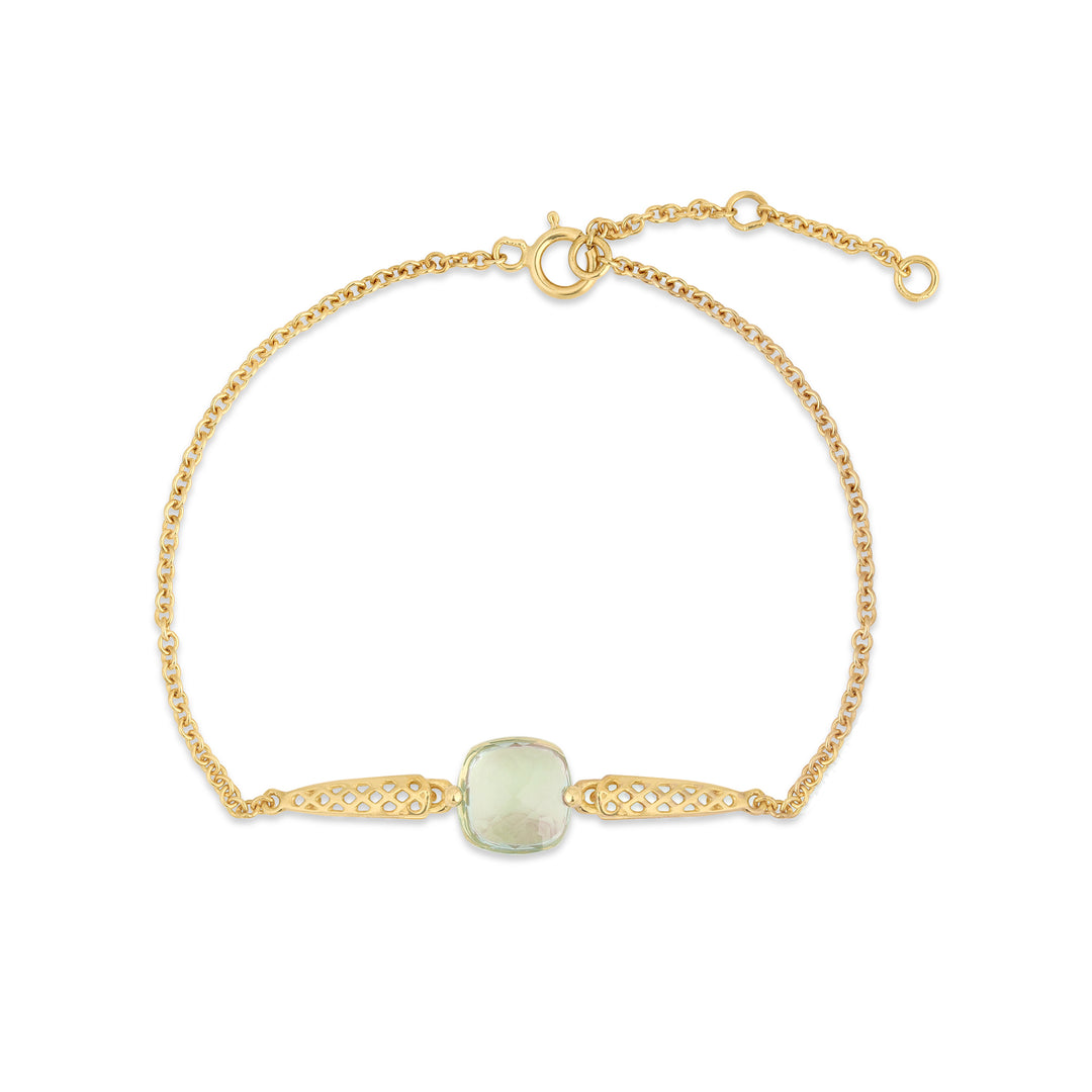 Accentuate your personalized style by accessorizing your outfit with this Frozen Lake Square-Cut Green 18k Gold Bracelet. A stunner piece with a delicate design that is sure to impress even the most discerning women. Showcasing flawless craftsmanship, this striking bracelet is made using 18k gold metal. The amethyst green gemstone gracefully sits in the square frame. The square-cut gemstone is adorned with mesh detailed gold accents on both sides. This lovely wrist bracelet is complete with a delicate bead chain. Featuring a secure closure, this gorgeous bracelet from Frost Collection is easy to wear and remove.